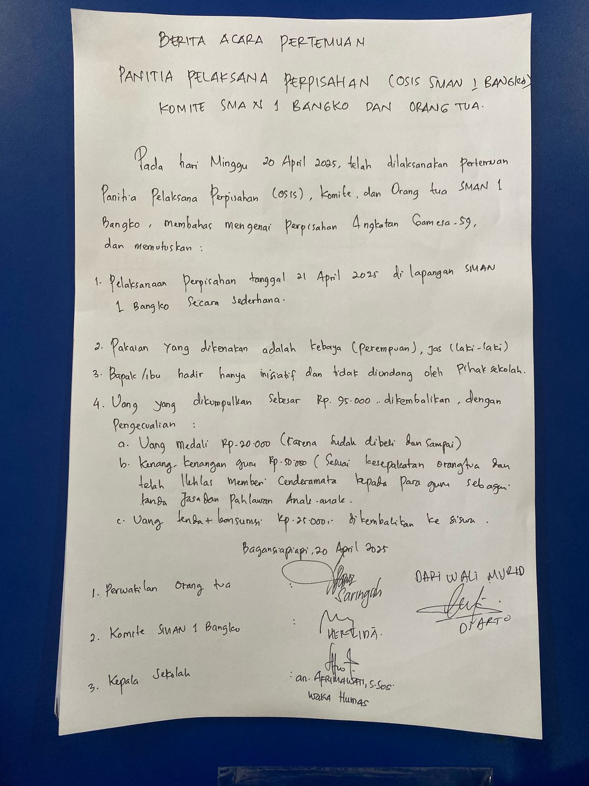 Tetapi setelah ada surat edaran tidak boleh mengadakan punggutan ke wali murid maka pihak sekolah SMAN1 Bangko telah mengundang wali murid dan menerangkan bahwa acara perpisahan memang dilaksanakan cuma hanya bersalaman dan penyematan mendali kepada murid -murid yang akan duduk kebangku perkuliahan dan akan dilaksanakan di gedung sekolah lantai 3 . Maka dari itulah guru -guru mengembalikan uang perpisahan ke wali murid.