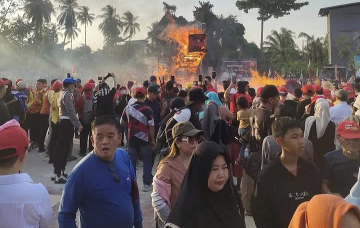 Replika tongkang sebuah perahu kayu simbolik yang dihiasi dengan ornamen merah dan kuning cerah sebagai lambang keberanian dan kemakmuran diarak secara massal menuju lokasi pembakaran. Prosesi ini dipimpin oleh puluhan pria berpakaian seragam kuning, disambut antusiasme ribuan warga yang memadati sepanjang rute arak-arakan.