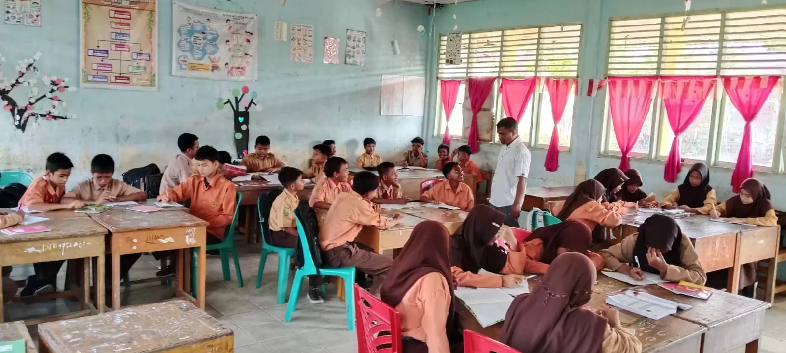Didampingi Masdalena, S.Pd., sebagai Kepala sekolah (Kepsek) SMP terkait, M. Nur Hidayat tampak ikut berbincang bincang ringan sambil sisi ruangan belajar mengajar.