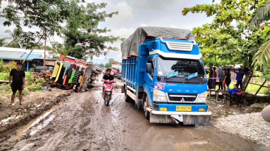 Jalan lintas Sinaboi Bagansiapiapi memakan korban, truk bermuatan sawit terbalik (Iwandi)