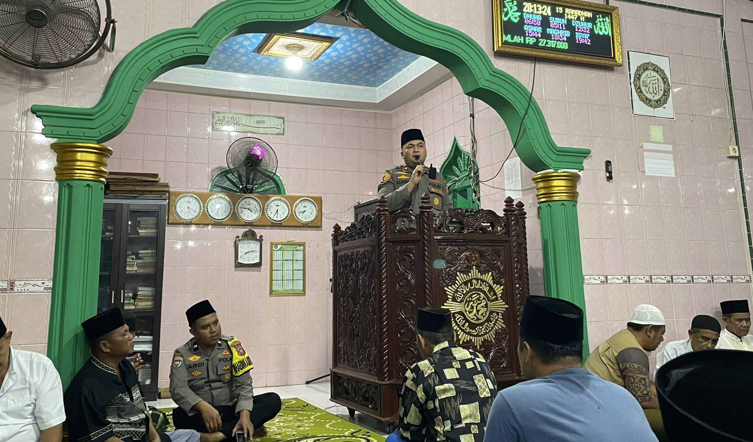 Bagansiapiapi, – Guna mempererat tali silaturrahmi sekaligus menciptakan situasi Kamtibmas yang tertib, aman, dan nyaman Polsek Bangko Bagansiapiapi melaksanakan kegiatan safari Ramadhan pada hari Rabu malam 4 Maret 2026 bulan suci Ramadhan 1447 H kegiatan tersebut dilaksanakan di Masjid Taqwa Muhammadiyah di Jln. Pusara hilir kepenghuluan Bagan Jawa Kec. Bangko Kab.Rokan hilir di mulai dari sekira pukul 20’00 wib selepas sholat ba’da isya hingga selesai.